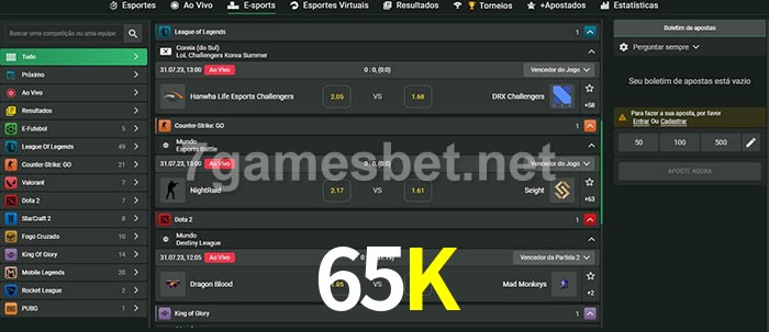 A aposta 65K oferece aos jogadores a experiência mais conveniente de apostas em eSports!